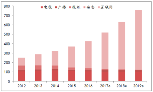 中国各媒体广告市场(单位:十亿)